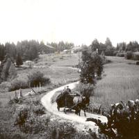 Sigurd Stubberud med høylass. Arvid sitter rett bak han. Til v. på bildet ser en huset til Henry Stubberud