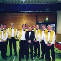 Fra v.: Magne Uv, Øivind Juul Nilsen, Kjell Engelbertsen. Leiulv Årmot, Kjell Pettersen, Karl Rukke, Torbjørn Sæter. Sverre Mortensen, Jack Pedersen, Frank Tanberg og foran i svart dress Arne Gullichen, som " hovmester". Kiwais Club sin gave til 75 års jubilanten var serveringen