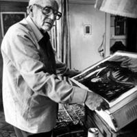 Dette er kunstmaleren Kai Fjeld, her mellom to stuer i sitt "kråkeslott" i Strandveien på Lysaker forteller hans niese, Trine Borge Johansen. Fra sin fetter, Sindre Fjeld, har hun fått følgende utfyllende opplysninger: "Motivet på silketrykket som ligger på lysbordet, heter "Menneske". Det finnes i 8 ulike varianter, alle laget i 1984. Fotografiet er tatt av fotograf Sverre Bergli, antakelig i 1984. Kai Fjeld, 1907 - 1989.