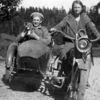 "Harley Davidson" med sidevogn. Hansine Bernås som fører og Stoffer ( Kristoffer ) som passasjer.