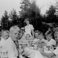 • På baksiden av bordet. fra H.: Tor Ekholt.- nn- nn-Marit Kari Rustand-Jorunn Prøis ( født Prøis ) Dorthea Thorrud (stående) - På forsiden.: Svein Prøis Echholt - Borgar Echolt ( titter frem ) -nn - Gunnar Prøis -nn- nn- Ole Karl Prøis - Brunsvik. Bidet er tatt i Hauanveien 14. Olaf Echolt sitt nye hus. Fødselsdagsfeiring hos Tjomsland.