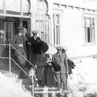 Kong Håkon var tilskuer og gjest under hovedlandsrendet i Konnerudkollen. Han og hans følge bodde på Konnerudkollen Turisthotell i to dager. Bildet er tatt på trappa foran hotellet. Konnerud Sanatorium ble bygget på gården Eskerud i 1896. Byggherre var: Grosserene Brecke, Rudolp og Andersen. Senere overtatt av hotelleier Jens Henriksen fra Tønsberg som utvidet til hotell. Etter første verdenskrig omdøpt til Konnerudkollen Turisthotell, drift til ca. 1940. Etter krigen ble hotellet benyttet som en underavdeling av Univerisitet i Oslo for 107 norske kostholdsstudenter som studerte engelsk over to semestre. De bodde på hotellet sammen med sine lærere. Denne form for college var en ny form for universitet i Norge. Kort varighet, fordi hotellet ble solgt til Europahjelpen i 1949 som mottaksstasjon for flyktninger .Siden brukt til kursted. Hotellet ble ombygd til det ugjenkjennelige i 1950. Staten overtok hotellet vedrlagsfritt i 1951 og det ble brukt som en underavd. til Lier sykehus i 1956. Hotellet brant sommeren 1967.