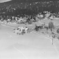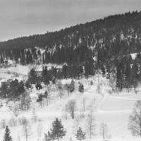 Bråthen i Mælen i forgrunn. Låven er på Hjellum. Gården Hjellum er revet. Den lå helt innerst i Mælen. I lia bak var det en liten hoppbakke, Hjellumbakken. Kunne hoppe 30-40 meter.
