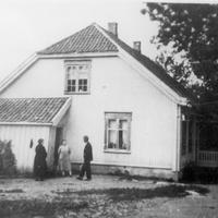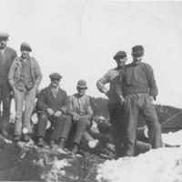 Manskap for skjæring av tømmer. Fra v. Sigurd Eriksen - Kåre Larsen f. Foskollen. - u - Halvor Skjeldrum ( kantmester ) - Karl Larsen - Harald Springover Johansen Det var så lite strøm på den tiden at de måtte skjære tømmeret om natt for at bøndene skulle strøm på dagtid.