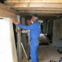 Hans Myhre (foran) og Tom Hayden kler en vegg i underetasjen der det er planlagt et lite skog- og sagbruksmuseum.