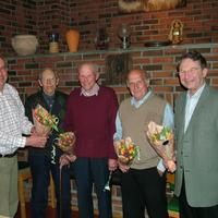 Fra Årsmøtet på Sørvangen. Ole Kristian Mortensen hedrer sagveteranene fra v.: Harald Johansen (Springover) ( 87 år) og Jørgen Skjeldrum ( 82 år) for sin innsats med filmen om Skjeldrumsaga. Videre Hans Austad og Pål Carelson fikk takk for bidraget fra Tømmerkjøpernes Fond til restaurering av Skjeldrumsaga ( kr. 40.000)