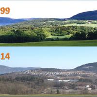 Bildet er tatt i 1999 fra Fjellsveien mot Kniveåsen, Knivegårdene, Øvre Eik og Godthåp. Fra 2004 er det anlagt et stort boligfelt, Kniveåsen, i området (se alternative filer).
