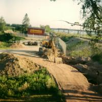 Arbeide i forbindelse med den nye motorveien ved Skoger stasjon som lå i bakkant av bildet. Brua over motorveien og jernbanen ses i bakgrunn. Den ligger i Sande.
