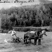 H.E. Fossum kjører slåmaskin. Han var eier av Galleberg Bruk. Han døde i 1957, 87 år gammel. Han kom fra Spydeberg