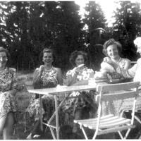 Fra v.: Gunnlaug Olsen (mor til Bergljot). Signe Bjørnerud. Ingerborg Bergflødt, Elna Karlsen og Anette Johansen ( min mor) Bildet er tatt trolig på " Sletta"