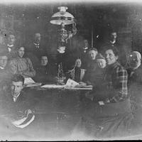 I Storstua på Stormoen: Hans, Ingvald, Aagot, Vigeland, Rickard, Maja, Gina, Svanhild Braathen, Margit, tante og far.