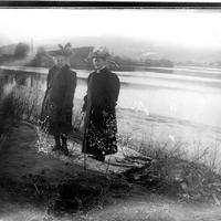 Frk Andresen og Jenny Broen ved Drammenselva. Langøya sees i bakgrunnen