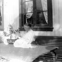 Dame med håndarbeid på Stormoen gård