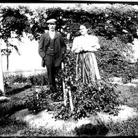 Tante Gurine og onkel Jens i hagen på Stormoen