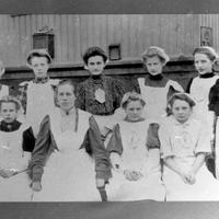 Foran fra v:nr 2 Bolette Gulbrandsen - 3. Lærerinne Marie Evensen - 4 Elisabeth Kopperud Fra v. bak : 1. Aagot Larsen fra Pukerud, - ukjent - ukjent 4.Molla Woldmann - 5 Kristiane Langum ?. ukjent 7. Ingrid Andersen g,m. kantor Andersen
