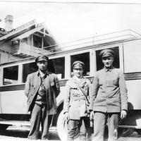 Konnerudbussen som var eid av Helgerud er parkert utenfor Konnerudkollen Turisthotell. Fra v.: Alfred Lobben, Erik Eriksen og Anders Ringstad. Konnerud Sanatorium ble bygget på gården Eskerud i 1896. Byggherre var: Grosserene Brecke, Rudolp og Andersen. Senere overtatt av hotelleier Jens Henriksen fra Tønsberg som utvidet til hotell. Etter første verdenskrig omdøpt til Konnerudkollen Turisthotell, drift til ca. 1940. Etter krigen ble hotellet benyttet som en underavdeling av Univerisitet i Oslo for 107 norske kostholdsstudenter som studerte engelsk over to semestre. De bodde på hotellet sammen med sine lærere. Denne form for college var en ny form for universitet i Norge. Kort varighet, fordi hotellet ble solgt til Europahjelpen i 1949 som mottaksstasjon for flyktninger .Siden brukt til kursted. Hotellet ble ombygd til det ugjenkjennelige i 1950. Staten overtok hotellet vedrlagsfritt i 1951 og det ble brukt som en underavd. til Lier sykehus i 1956. Hotellet brant sommeren 1967.