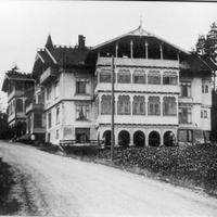Utsikt mot Hotellet. Konnerud Sanatorium ble bygget på gården Eskerud i 1896. Byggherre var: Grosserene Brecke, Rudolp og Andresen. Senere overtatt av hotelleier Jens Henriksen fra Tønsberg som utvidet til hotell. Etter første verdenskrig omdøpt til Konnerudkollen Turisthotell, drift til ca. 1940. Etter krigen ble hotellet benyttet som en underavdeling av Univerisitet i Oslo for 107 norske kostholdsstudenter som studerte engelsk over to semestre. De bodde på hotellet sammen med sine lærere. Denne form for college var en ny form for universitet i Norge. Kort varighet, fordi hotellet ble solgt til Europahjelpen i 1949 som mottaksstasjon for flyktninger .Siden brukt til kursted. Hotellet ble ombygd til det ugjenkjennelige i 1950. Staten overtok hotellet vedrlagsfritt i 1951 og det ble brukt som en underavd. til Lier sykehus i 1956. Hotellet brant sommeren 1967. -