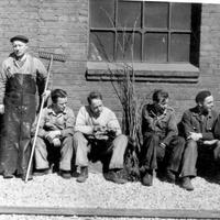 Verkstedsarbeidere utenfor smia, med Erling Thoresen helt til høyre på bildet.