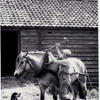 Harald kjører sleip med travhesten "Glatina" 1980. Han skal ligge på skauen og hogge tømmer ei uke, På sleipet har han mat og klær for hele uka. Føllet Frk. Glatina er med Ole Karl stopper for en prat Tekst: Torill Juel
