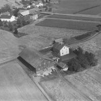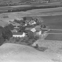 Hans Unelsrød. Alle bolighus hvite. Alle uthus røde med hvite lister og glugger. Alle tak med rødbrun tegelsten. Veien på skrå over bildet er Unelsrødlina
