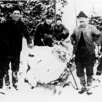 Tømmerkjøring i 1942, Bjerk som skulle brukes til kubbestol. Fra v, Anton Gravdal, Martin Haugen, Kåre Halden, Ole Karl Prøis, Gustav Langeland, Paul Hansen ( Pål Svingen )