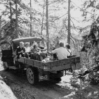 Gunnar Prøis fikk denne Ford lastebilen etter krigen. Den hadde stått gjemt på en låve . Her er Gunnar Prøis med venner på vei mot store Gravdalstjern.