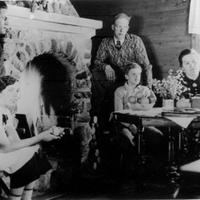 Peisestua - Plassane i påsken 1938. Grammafonen er med. Fra v. Ester Haveråen f. Wold, Olaf Haveråen, Harald Wisting, Sittende : Helge Furuvold, Mathea Wisting f. Haveråen