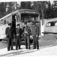 Bidet er tatt på snuplassen ved Konnerudkollen hotell. Fra v.. Knut Breibrenna - NN - Lauerud - Harald Johansen (Springover)???? SH Busslinjer var eid av Svein Helling.