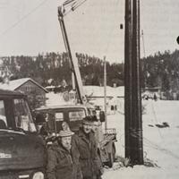 Tekst fra Skauger 1980 nr. 1 side 4 Bildet er tatt i Mehlen. Skoger ble innlemmet i Drammen i 1964, derfor heter etaten nå Drammen Elektrisitetsverk. I 1980 var det ombygging av lavspentlinjen langs Jarlsbergveien. "Det skal tilslutt bare bli en stolperad, og det blir gatelys på hver mast" kan Anders Borge fortelle. På grunn av den nye sentralkirkegården blir også høyspentlinjen over Prestegårdseiendommen ombygd i disse dager. Før var det 13 stolper over eiendommen, nå blir det bare 3 stolper. Litt vemodig kanskje at en gammel jernmast m/transformator, som skal være en av de eldste arragementene i Skoger, må falle. Men den har gjort sin tjeneste.