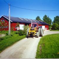 Våronn på Knive. Ingar A. Steen på vei til jordet med såmaskin. Traktor: Massey Ferguson 185 1972 modell. Såmaskin: Nordsten kombimaskin, 2,1 meter, 1977 modell.