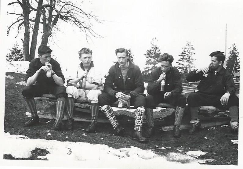 Unge Konnerudgutter (18-19 år) i påsken 1960 som hadde vært på treningsleir på Skulkerud. Rast på hjemveien.(tekst: Per Runar Thoresen)Fra V: Per Runar Thoresen, Geirr Kihle, Erik Grinderud, Jacob Kollerud og trener Olaf Nilsen.