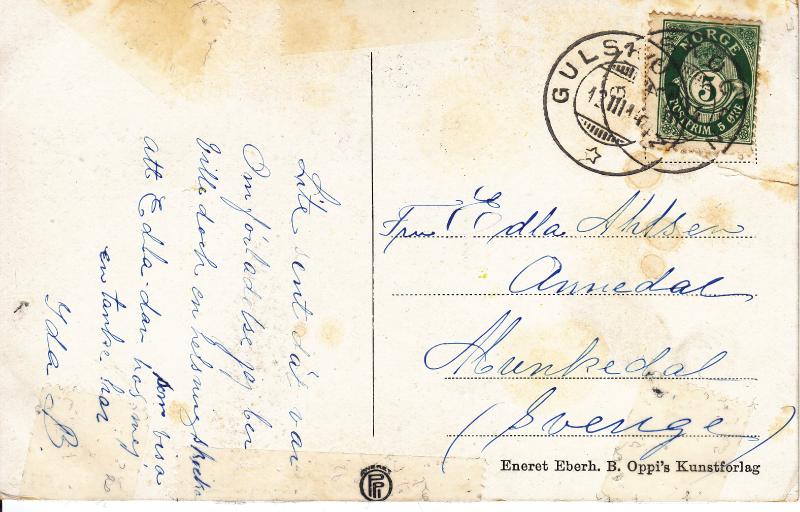 Bildet er tatt fra Stordammens nordside. Hotellet ble på denne tiden drevet som Sanatorium Gjesten har sendt kortet til mottaker i Sverige og er poststemplet på Gulskogen for 5 øre i porto. Kortet antakelig sendt på begynnelsen av 1900 tallet. Alternativt bilde viser tekstsiden på kortet. Se mer omtale av hotellet på bilde nr 43.