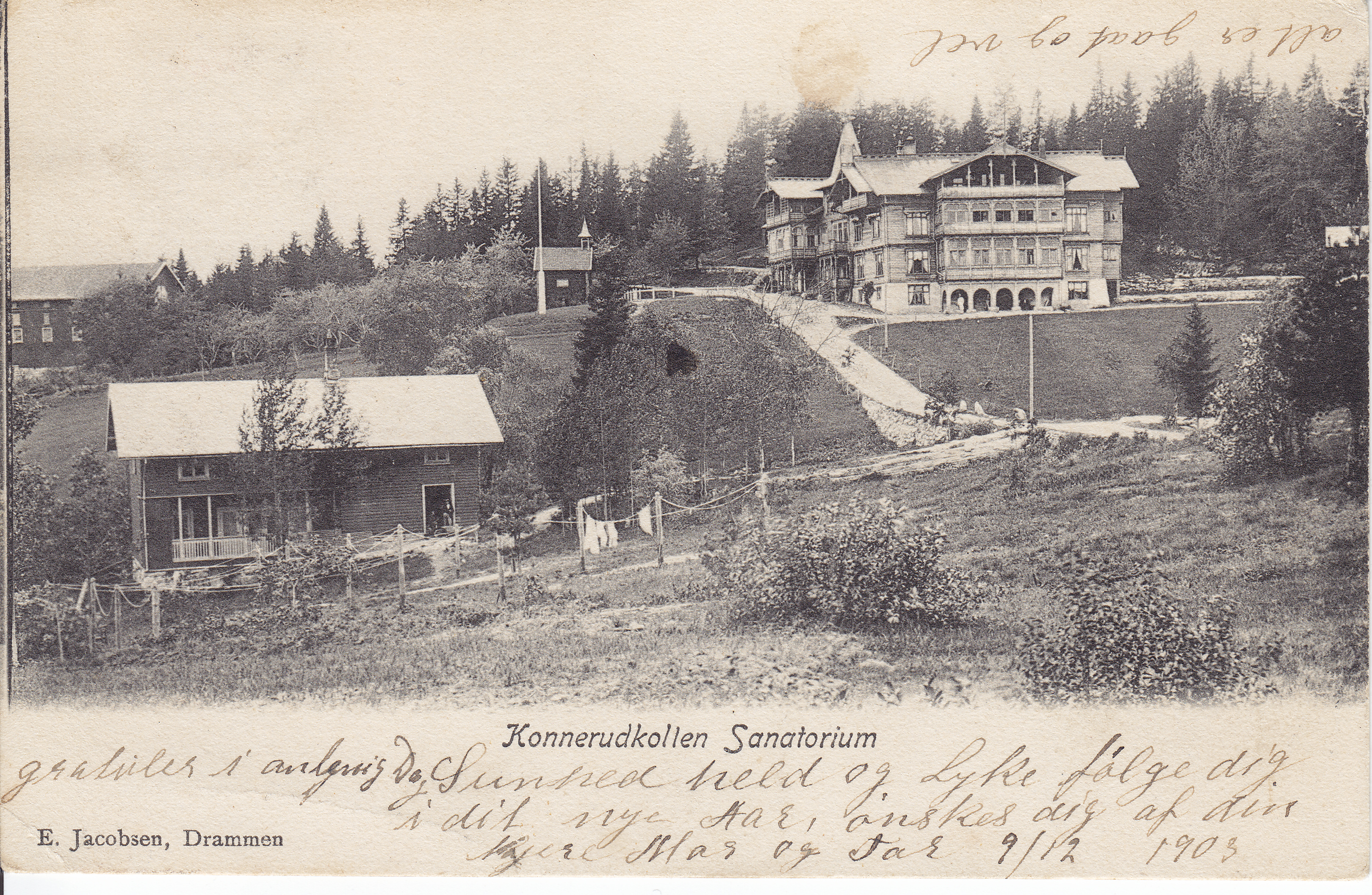 Postkort fra Konnerudkollen Turisthotell som på denne tiden ble drevet som et sanatorium. Bildet tatt på begynnelsen av 1900-tallet fra "Sundlandsvingen". Til venstre ser vi hotellets bad/vaskeri ved bekken som fortsatt renner forbi stedet. Kortet er sendt 9. desember 1903 til mottaker i Tyskland. (Se alternativt bilde- baksiden av kortet). Mer omtale av hotellet på bilde nr 43. Mer omtale av hotellet på bilde nr,. 43