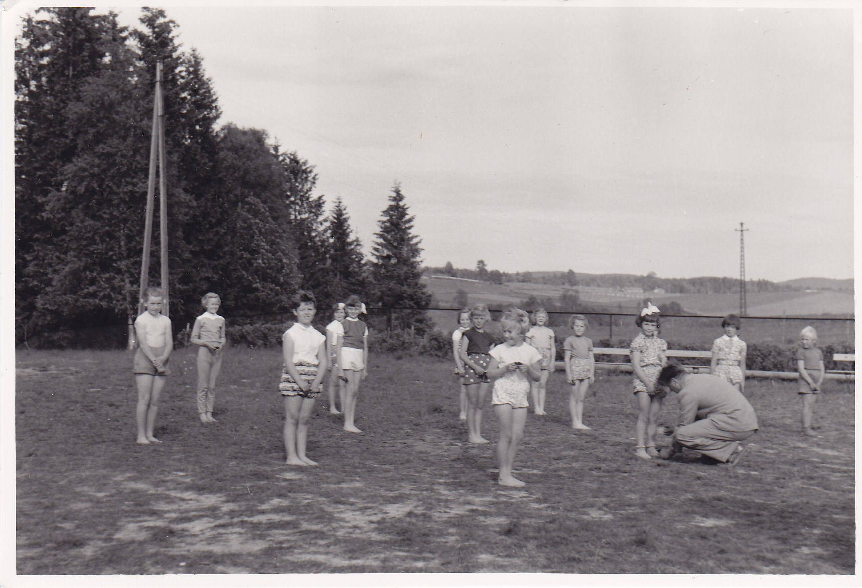 "Linjegymnastikk" for jentene i 4 klasser. Fra venstre: Live Johnsen (Røine), Berit Berntsen (Amundsen), Jorunn Aaserud, ?, Trine Borge (Borge Johansen), Marit Hansen ( ? ), Turid Beheim (Tanum), ?, Anne Marie Leret, Marit Kaspersen ( ? ), Inger Juel (Hoven), Randi Juel (Raaen), Vera Kaspersen ( ? )
