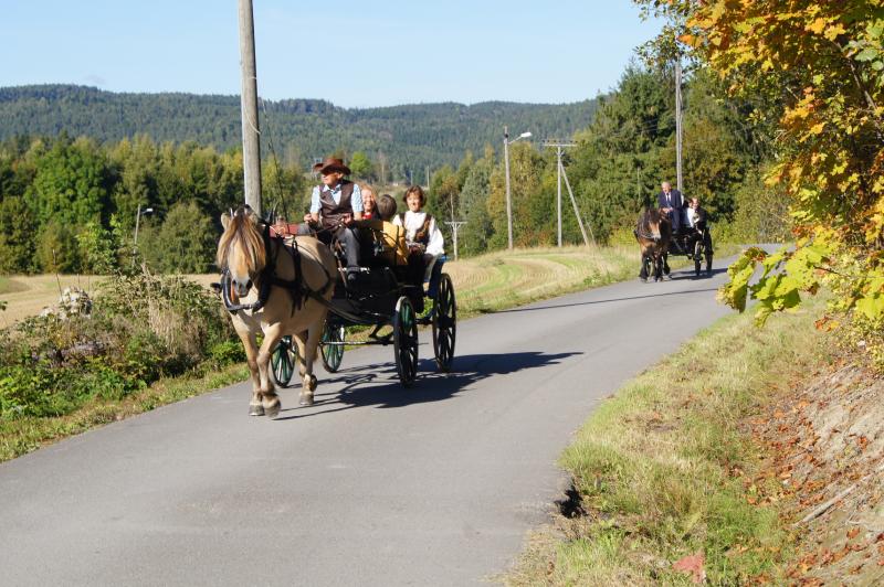 Representantene fra familene til de 5 Eidsvoldsmennene kom til Skoger gamle kirke med hesteskyss. Hestene og Trillene hører til på Skalpe, og kusken i første ekvipasje her er Arne Finsrud, i andre Hennum.