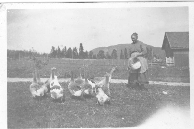 Hanna (f. Skustad) Johnsrud (1870-1954) mater gjessene på gården.