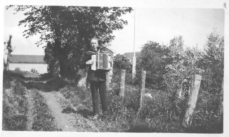 Markus Johnsrud spiller trekkspill i hagen hjemme på Thorrud gård.