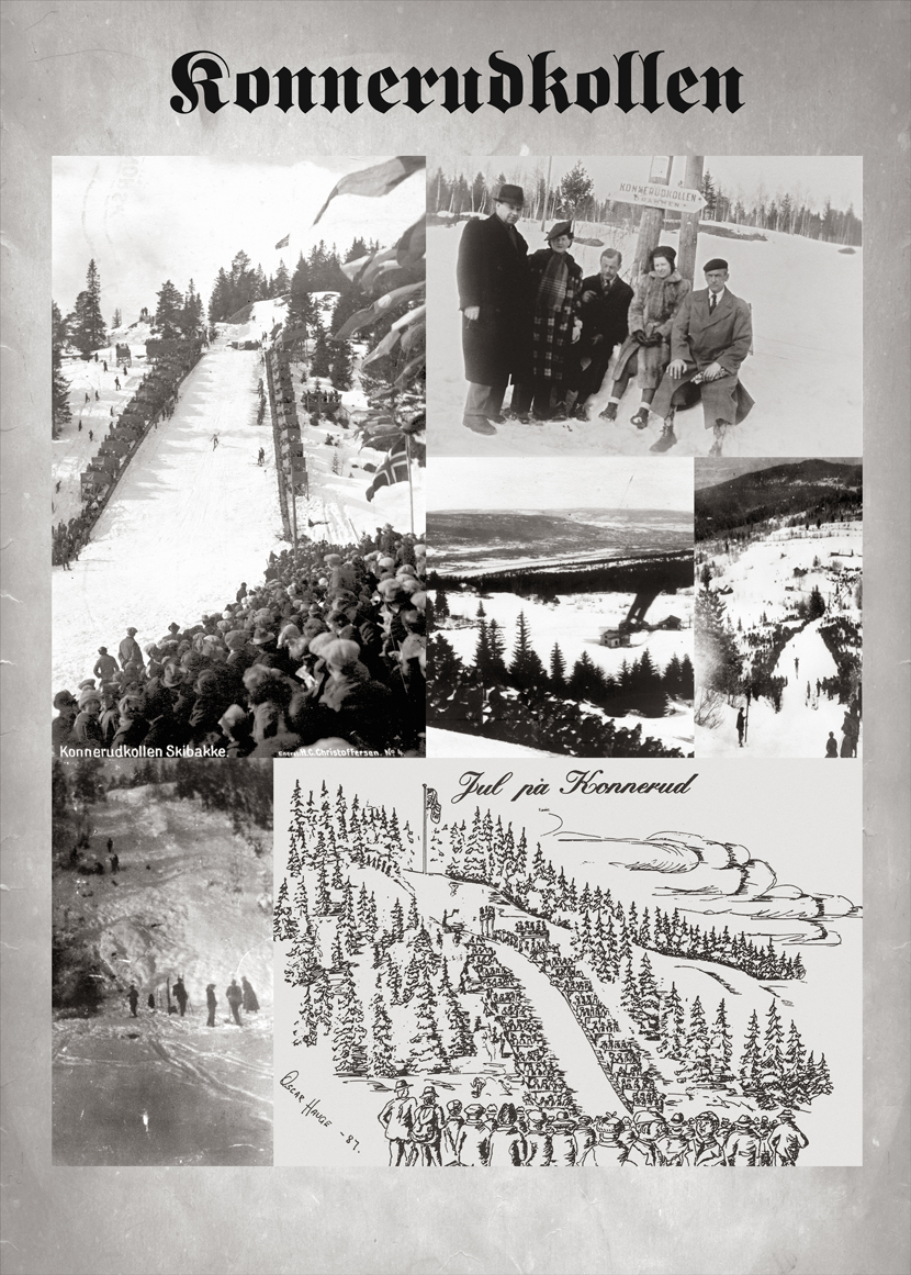 Fotomontasje Konnerudkollen skibakke. Historisk Vandring 2013. "Det Dramatiske Selskab" Teatergruppa.Enkeltbilder finner du ved å søke på Konnerudkollen Skibakke eller Konnerudkollen