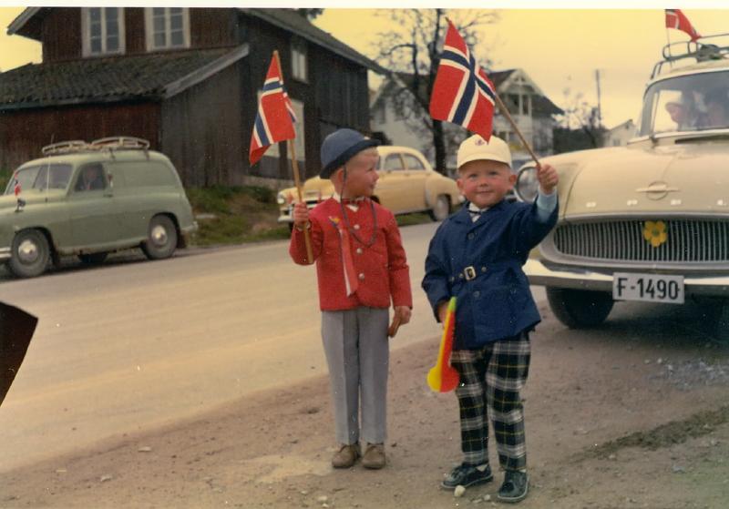 Guttene: Ole Solberg(tv) og Karl Atle Kittelsen. Den mørke bygningen er sidebygning på Samuelsvollen.Den grønne bilen er en Standard Vanguard. Bilen bak guttene er en Opel Rekord. Slutten av 1960-tallet.