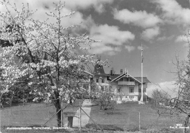 Postkort av Konnerudkollen Turisthotell fra "storhetsdagene" før ombyggingen i 1950.Bildet er tatt med Stordammen "bak ryggen" på fotografen.