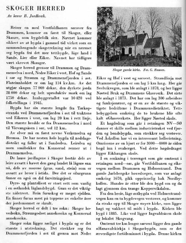 SKOGER HERRED Av lærer B . Jordbræk . Reiser en med Vestfoldbanen sorover fra Drammen, kommer en først til Skoger, eller Skauer, som bygdefolk sier . Navnet kommer sikkert av at bygda i gammel tid virket som en sammenhengende skogstrekning når en nærmet seg bygda frd det mer tettbygde, låge land i Sande, Lier eller Eiker. Navnet har tidligere vært skrevet Skauger. Skoger herred grenser til Drammen og Drammenselva i nord, Nedre Eiker i vest, Hof og Sande i sør og Stromm og Drammensfjorden i ost. Flateinnholdet er om lag 114 kv.km . Av det utgjor skogen 77 000 dekar, den dyrkete jorda 28 000 dekar og helt uproduktiv mark om lag 1750 dekar . Innbyggertallet var 10 420 ved folketellinga i 1945 . Bygda har sin storste lengde fra Torkopstranda ved Drammensfjorden i ost til traktene ved Eikeren i vest, om lag 20 km i rett linje. Den storste bredde er fra Drammenselva i nord til Vievangsasen i sor, vel 12 km . Av elver må en forst nevne Verkenselva og Bremsa . De har nesten hele bygda til nedslagsdistrikt og faller ut i Sandeelva. Leirelva og noen småbekker fra Konnerud renner ut i Drammenselva . De lause jordlagene i Skoger består dels av leire avsatt i havet den gang landet lå lågere enn nå, dels av morene (grus, sand, stein) som er avsatt av breir i istida . Der det er silurgrunn finner en også en del forvitringsjord . Dyre- og plantelivet er stort sett som vanlig i en ostlandsk låglandsbygd. Gran er det viktigste nåletreet. Rein furuskog er meget sjelden. En finner furua mest på toppene av enkelte åser der jordsmonnet er skralt . Skoger herred er delt i tre sokn : Skoger hovedsokn, Stromsgodset annekssokn og Konnerud annekssokn . Skoger sokn ligger sorligst i bygda og er det :storste i utstrekning. Det strekker seg fra Drammensfjorden i ost til grensa mot Nedre Skoger gamle kirke. Fot. G . Baasen. Eiker og Hof i vest og sorvest. Strandlinja mot Drammensfjorden er øm lag 5 km lang . Her gar Svelvikvegen, som ble anlagt i 1878, og her ligger Nosted Bruk og Drammns Glassverk. Det siste ble anlagt i 1873 . Det har om lag 300 arbeidere og funksjonærer, og er en av de storste og viktigste bedriftene i Drammensdistriktet . Tettbehyggelsen omkring de to brukene blir ofte kalt cGlassverket» . Her Jigger Nosted skole. Et hogdedrag som gar i retningen NV-SØ danner et skille mellom industristroket ved fjorden og bondebygda, som strekker seg vestover . Ved Askollen har vi en interessant helleristning . Omrissene av en hjort er for 3000-4000 år siden hogd inn i svaberget . Ved dette hogdedraget Jigger Eikhaugen skole. I en senkning i terrenget som gar omtrent i retningen nord-sor, gar Vestfoldbanen og riksvegen mellom Drammen øg Holmestrand. Den gamle Jarlsbergske hovedvegen, som var anlagt omkring 1670, gikk opprinnelig bak Nordbykollen . Hundre år etter ble den bygd om og da lagt gjennom den trange Koppervikdalen . Fra den breie, låge ostbygda ved Holmestrandvegen kan en to bygdevegen vestover, og kommer da straks opp til Skoger