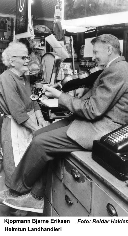 Det var mye morro på Heimtun Landhandleri, også bak disken. Her spiller kjøpmann Bjarne Eriksen for fruen.