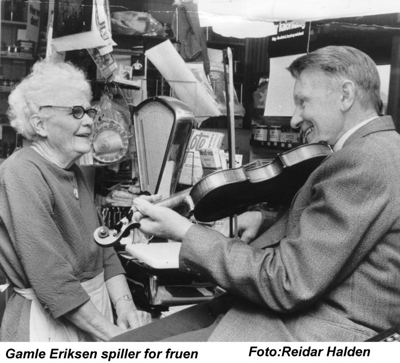Det var mye morro på Heimtun Landhandleri, også bak disken. Her spiller kjøpmann Bjarne Eriksen for fruen (Ragnhild).
