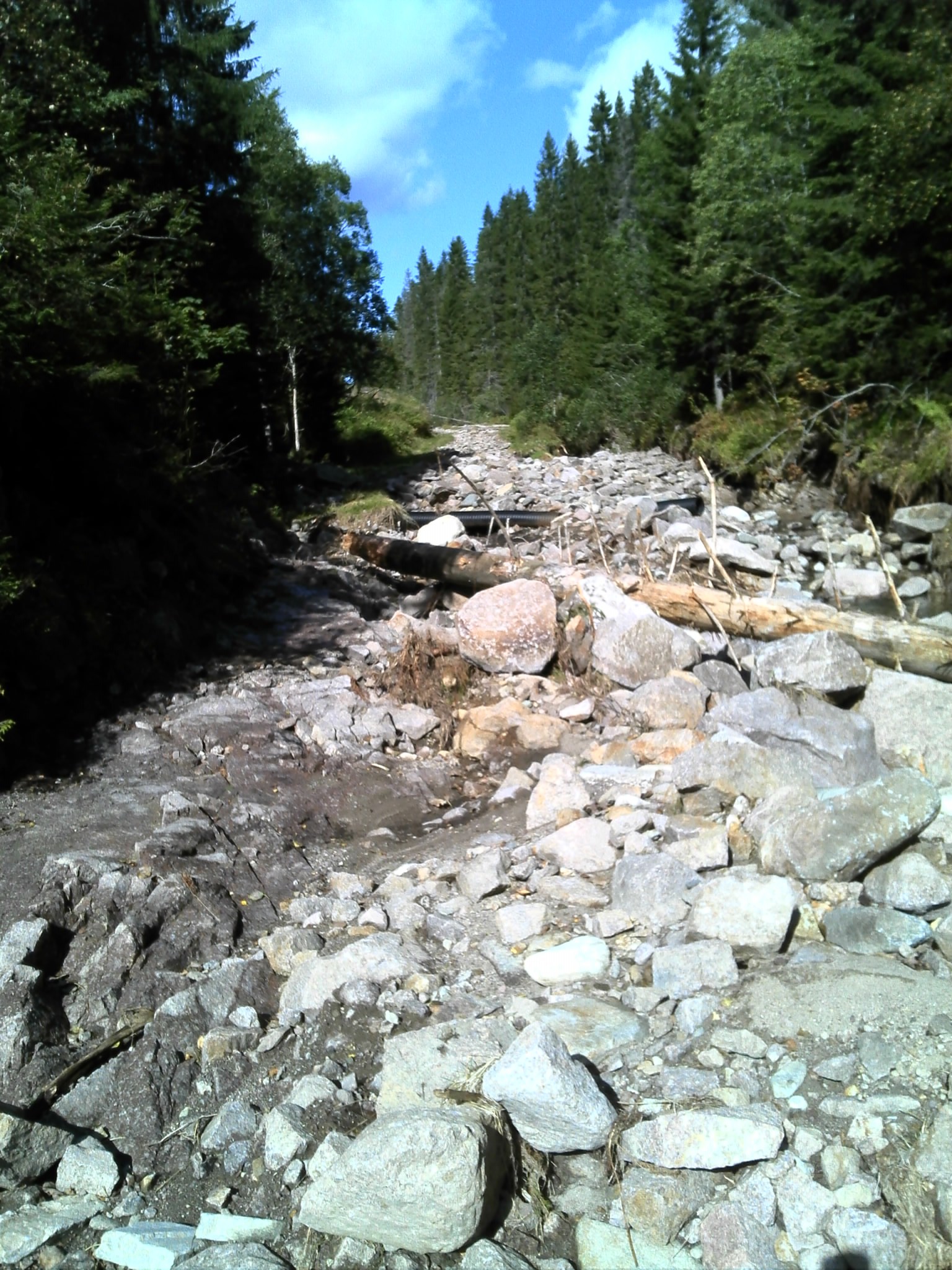 Uværet "Frida" som kom inn på ettermiddagen 6.8.2012 og herjet også natt til 7.8.2012, gjorde store skader i Eikerbygdene. På Vestskogen ble mange av skogsbilveiene til Selvik Bruk helt eller delvis ødelagt. Bildene viser hvordan det så ut oppover Katthusdalen etter "Frida". Skogsbilveien var for en stor del fullstendig rasert og erstattet av et eleveleie med store steiner.