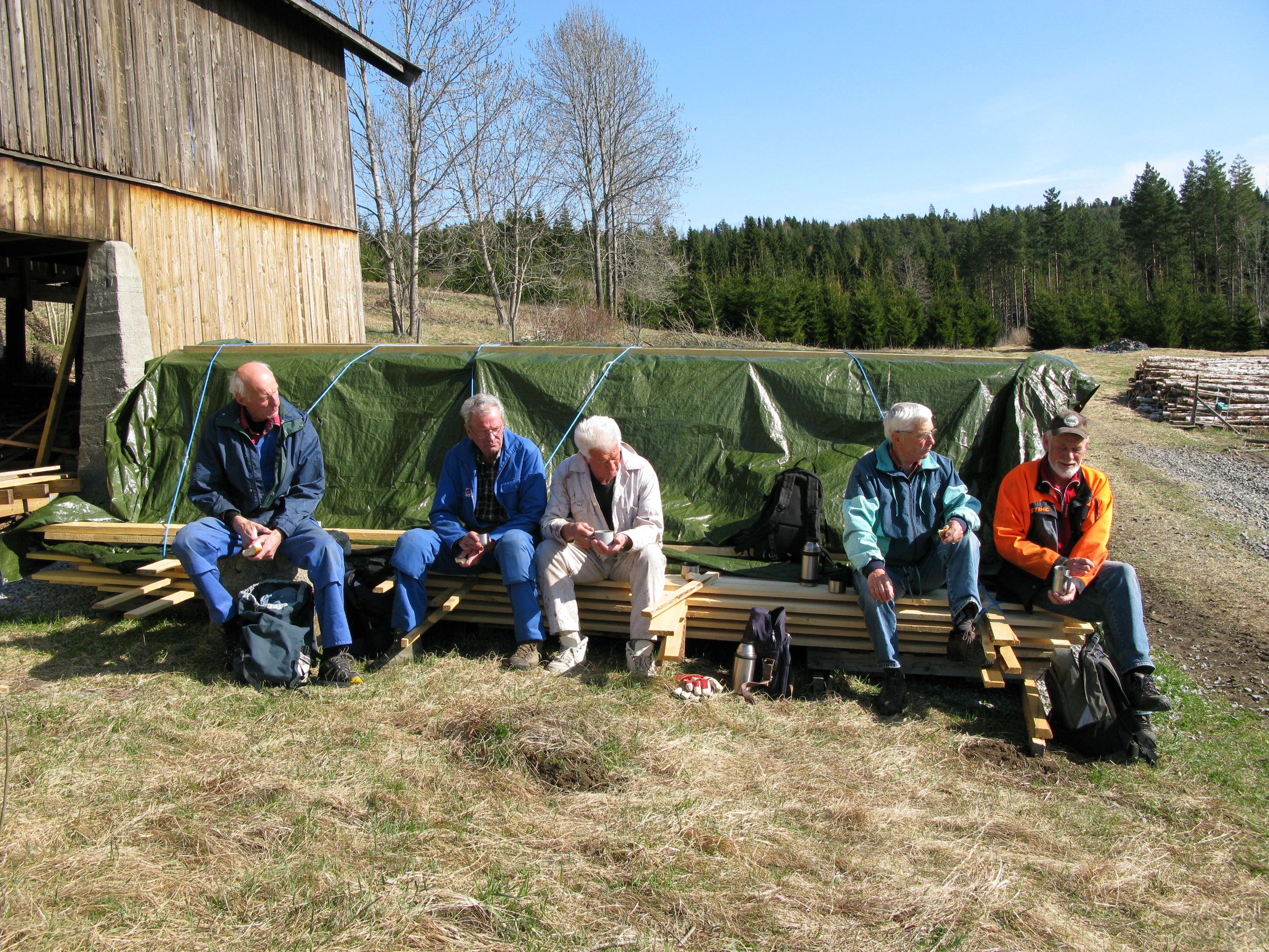 Lunsjpause for dugnadsgjengen (noen manglet denne dagen) første dugnadsdag i 2012. Fra venstre på bildet: Thor Jahren, Hans Myhre, Tom Hayden, Reidar Halden og Roger Strøm Andersen.