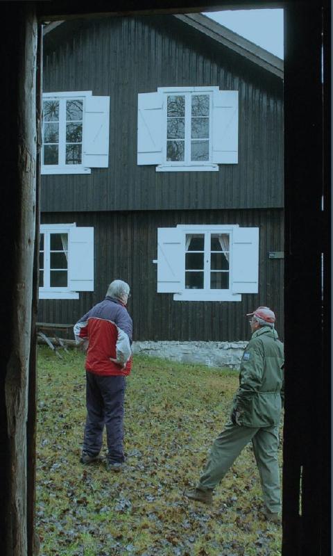 Bildet fra Rønnehue brukt som forside på Historielagsnytt nr. 2 i 2011. Fotograf Reidar Halden. Bildet er tatt med kameraet på innsiden av døren til skjulet. Derfor den spesielle virkningen med smalt bilde. Rønnehue er en av de mest bebodde boplassene på Vestskauen og vi har registrert beboere med navn helt fra 1820-åra. Siste beboelse var ved begynnelsen av 1950-tallet. Personene på bildet er Rer Runar Thoresen og Hans Myhre.. Bildet er tatt i anledning nybeiset bygning og en herlig tjærelukt preget omgivelsene i lang tid. Et par år senere ble skjulet beiset. Historielaget har siden 1997 leid Rønnehue av Selvik Bruk mot at vi holder plass og bygninger i orden. Det er den faste dugnadsgjengen på 6-7 personer som har beiset og som forøvrig står for alt vedlikehold.