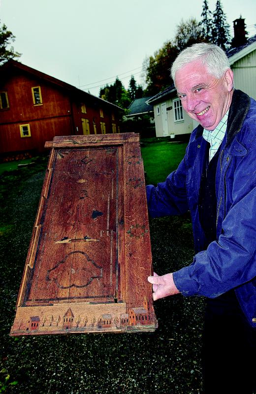 Skapdør som stammer fra kong Fredriks besøk på Konnerud i 1749. Døra eies av Stiftelsen Konnerudverket og vises fram av Nils Otto Larsen.