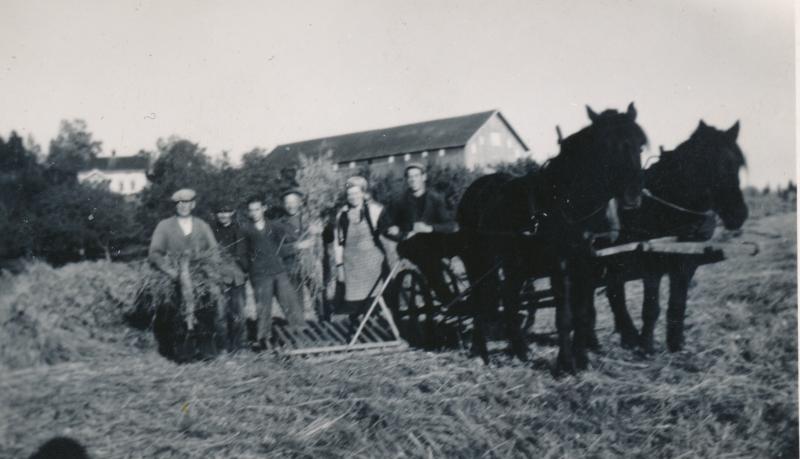 Østbygda, skur, hest slåmaskin, kornåker, kornband, rauk, rauking