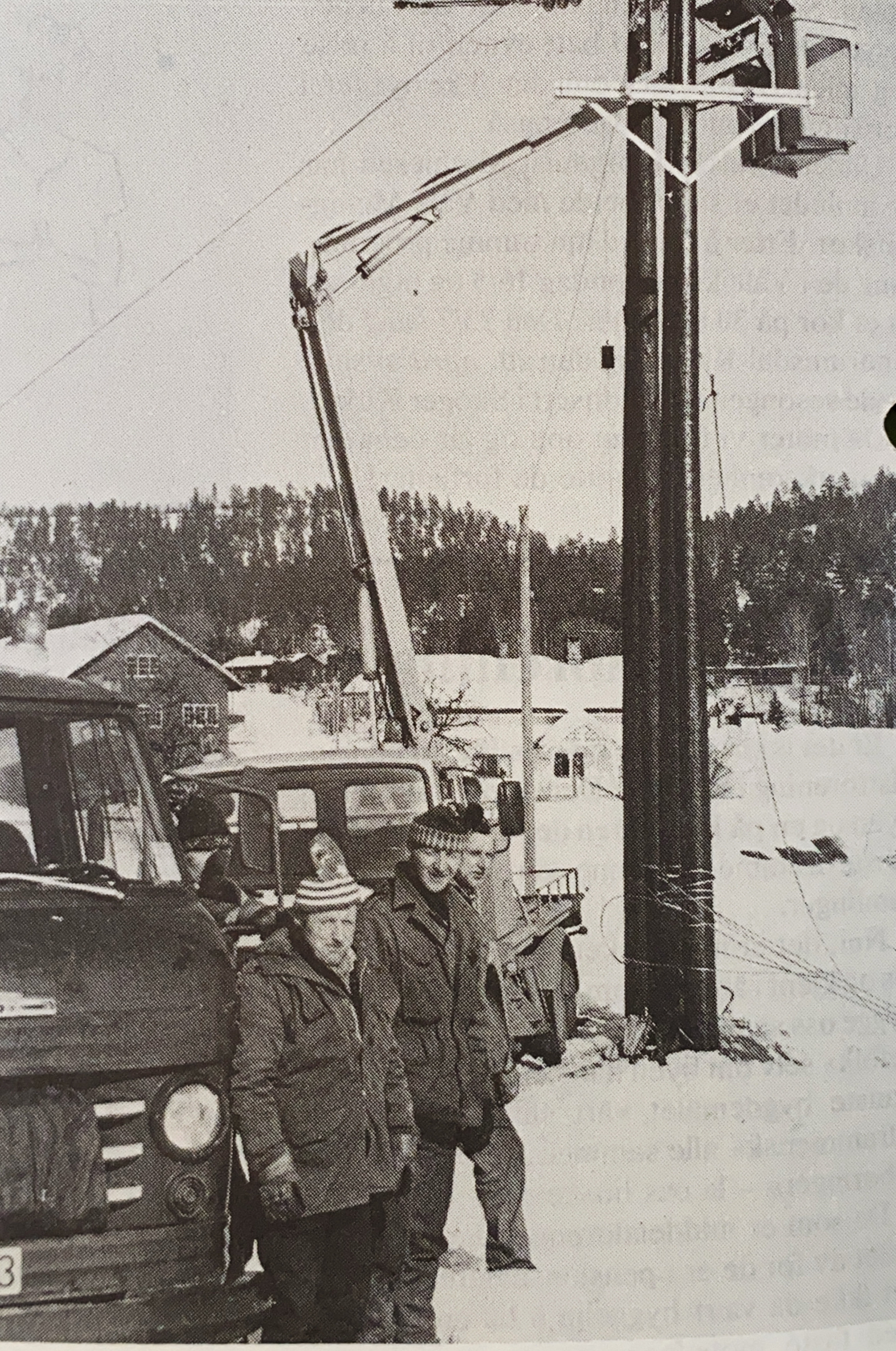 Tekst fra Skauger 1980 nr. 1 side 4 Bildet er tatt i Mehlen. Skoger ble innlemmet i Drammen i 1964, derfor heter etaten nå Drammen Elektrisitetsverk. I 1980 var det ombygging av lavspentlinjen langs Jarlsbergveien. "Det skal tilslutt bare bli en stolperad, og det blir gatelys på hver mast" kan Anders Borge fortelle. På grunn av den nye sentralkirkegården blir også høyspentlinjen over Prestegårdseiendommen ombygd i disse dager. Før var det 13 stolper over eiendommen, nå blir det bare 3 stolper. Litt vemodig kanskje at en gammel jernmast m/transformator, som skal være en av de eldste arragementene i Skoger, må falle. Men den har gjort sin tjeneste.