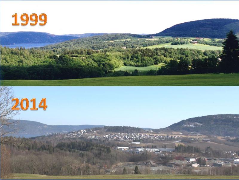 Bildet er tatt i 1999 fra Fjellsveien mot Kniveåsen, Knivegårdene, Øvre Eik og Godthåp. Fra 2004 er det anlagt et stort boligfelt, Kniveåsen, i området (se alternative filer).